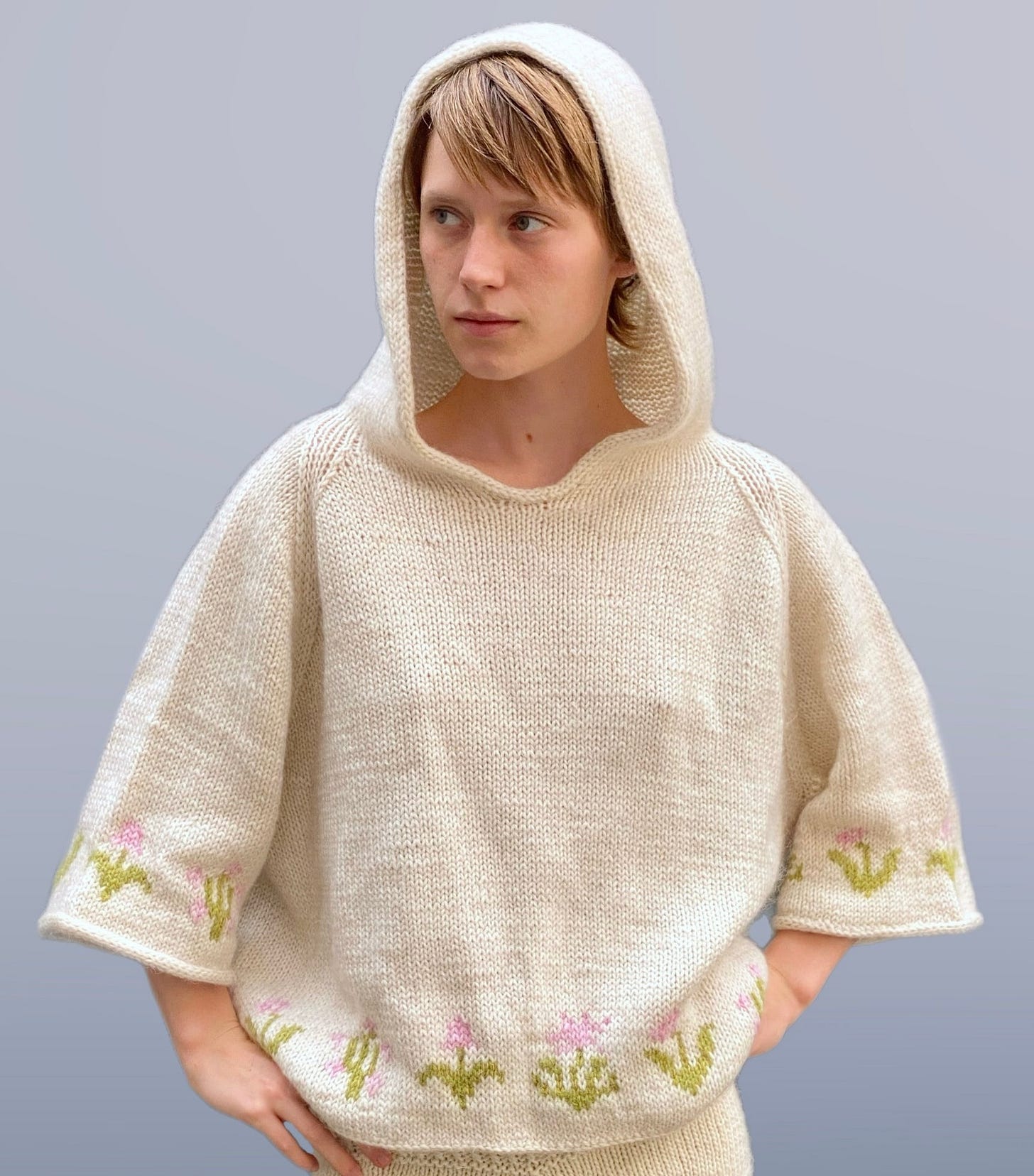 This first hoodie took my breath away. The thing that is most appealing about this to me, besides the obvious ( flowers ), is the hood. Knitting a hoodie has been on my bucket list for so long, and honestly seems way easier than it looks.